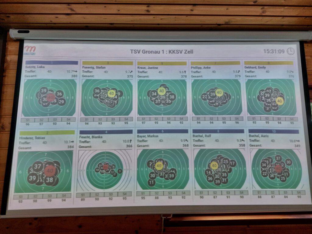 Anke Phillip legte auf Position 4 nochmals zu und übertraf mit 379 Ringen ihr erstes Ergebnis, womit auch sie den Punkt nach Gronau holen konnte. Auf Position 3 fand Justine Kraus zu ihrer gewohnten Leistung zurück. Gegen ihre 378 Ringe hatte der Gegner aus Zell keine Chance und musste den Punkt Gronau überlassen.